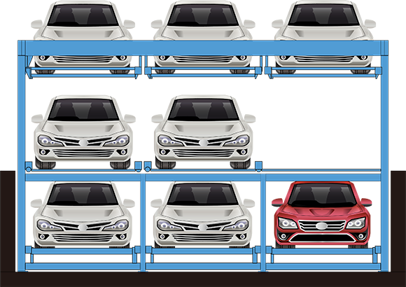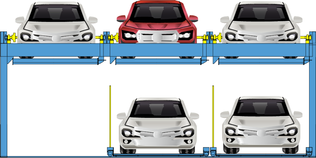 升降橫移式類停車設備工作時要留有交換車位,即空車位,其有效停車數量的計算并不是地面停車位數與層數的簡單疊加,通常把較大型的車庫劃分成若干個單元,一個單元只能按先、后一人進行存、取車的操作,不能兩人或多人同時進行。